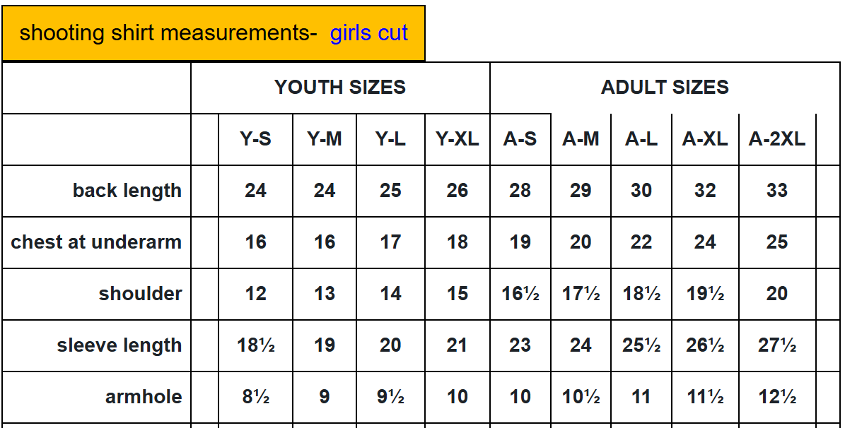 When indicating the size of the shooting shirt, you may want to go up a size, as the shirt goes over her uniform jersey. There are no refunds or exchanges, as these are a custom order.